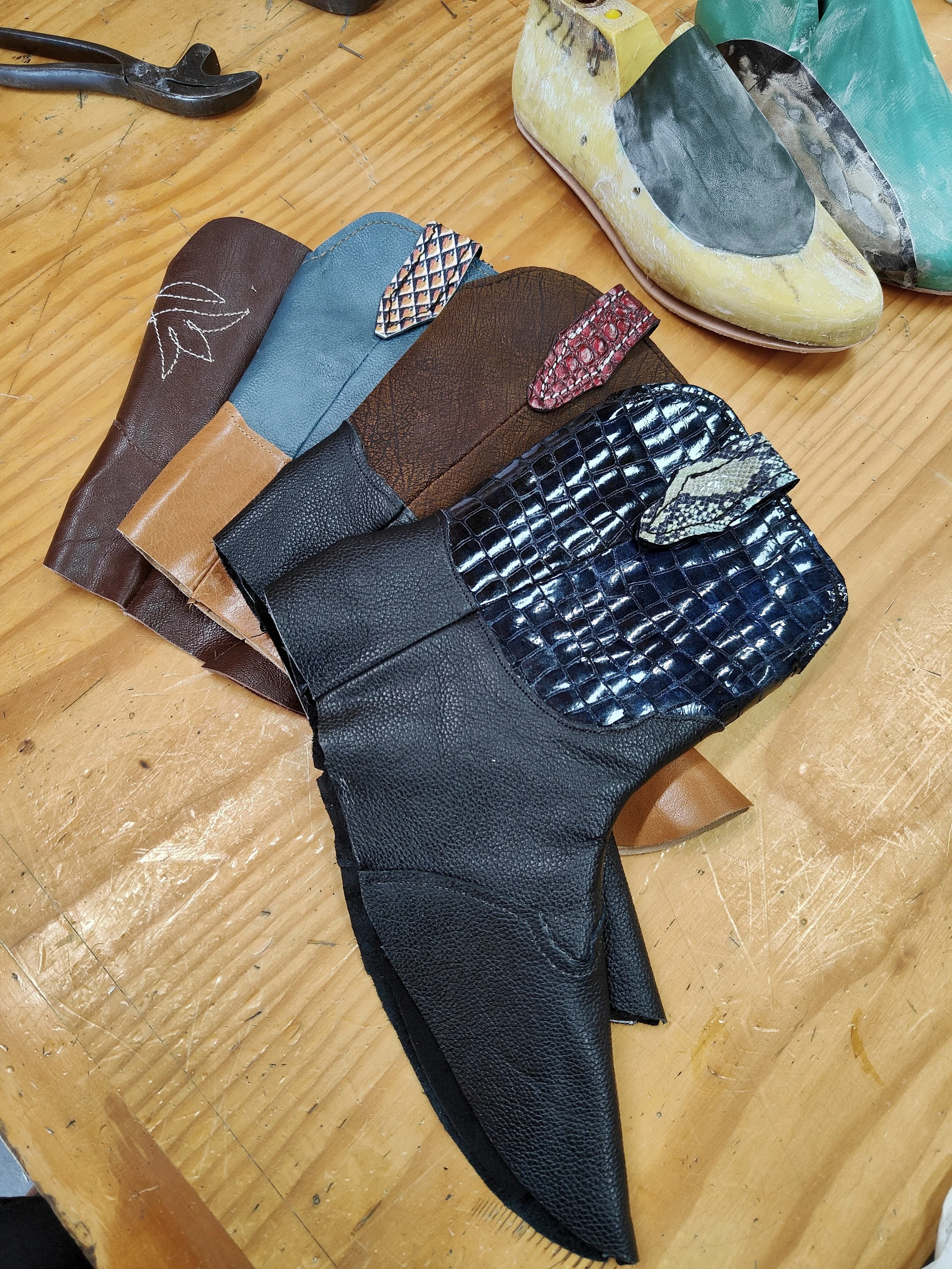 Trying on mock-ups, selecting leathers, and cutting out your uppers.